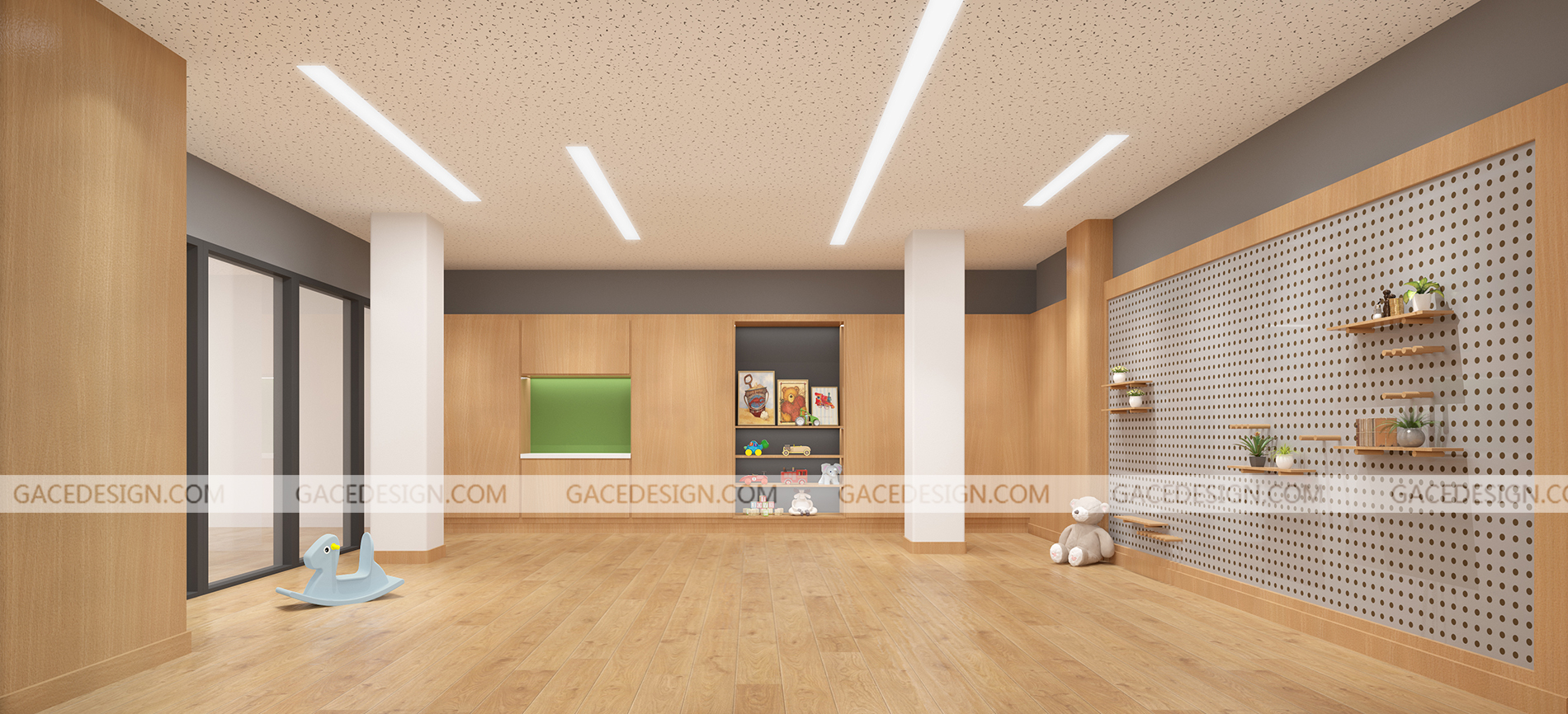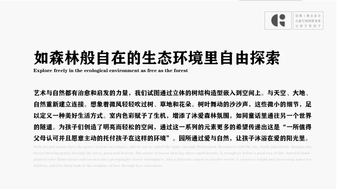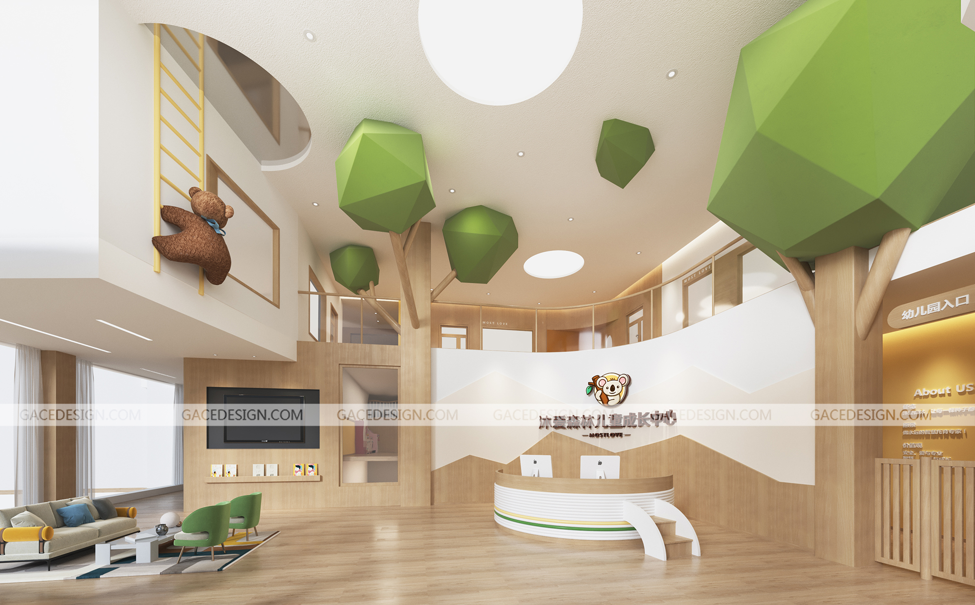 設計思考:在新一代的年輕群體中,傳統教育空間的風格并不再適合日益成熟的教育市場。精致度、專業度、品質感,以及體驗,可觀成為新的空間訴求。空間應與產品,兒童、社區、家庭和教育相輔相成。設計應符合當下傳遞出品牌的專業度。塑造讓年輕群體們得以信任的教育機構。我們希望塑造出來的空間是可以讓兒童對話的,本次我們以品牌名「沐愛森林」為延展主題,展開一系列情境表達。