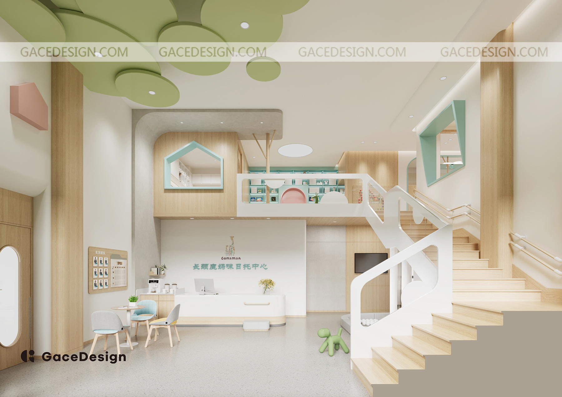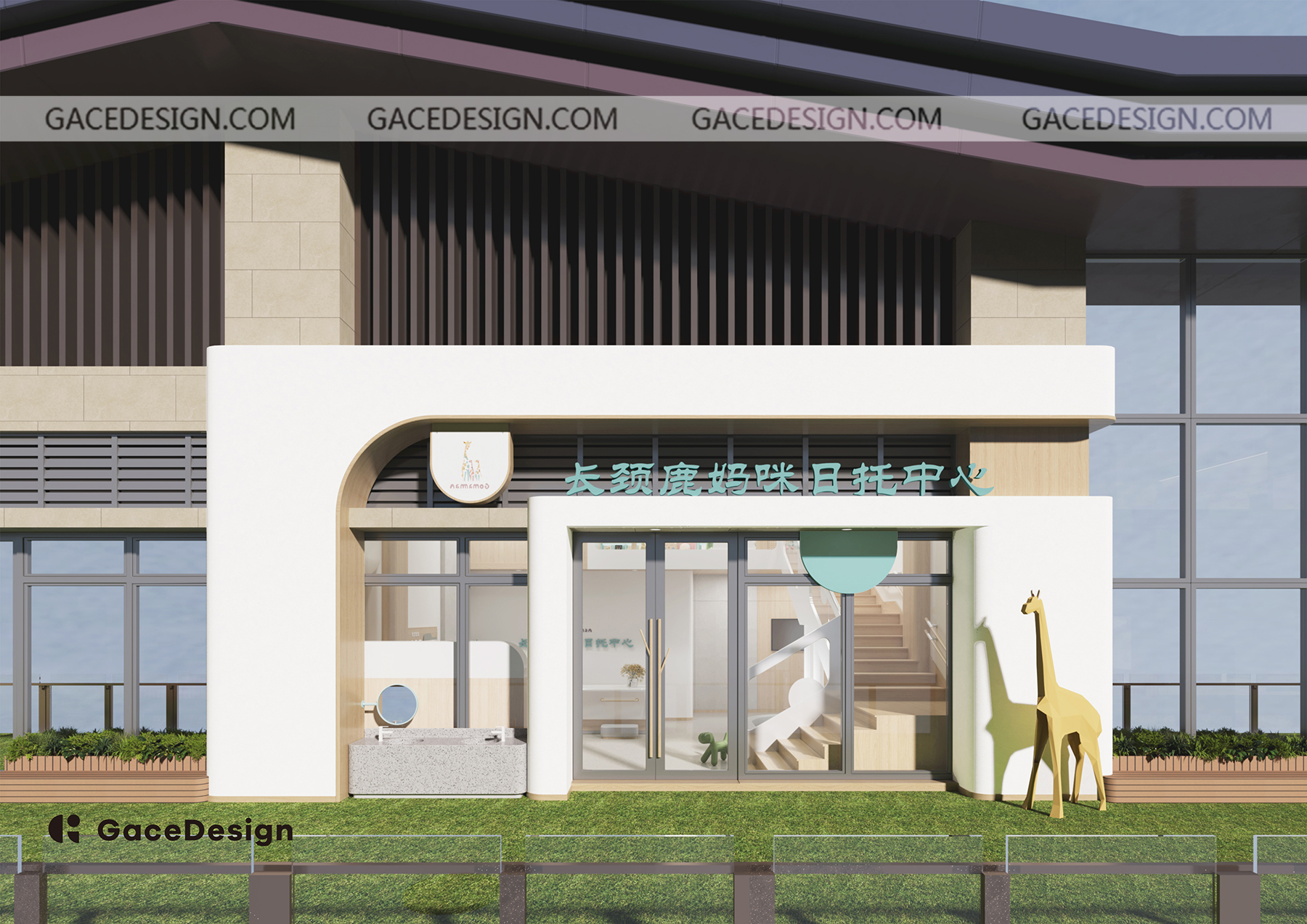 設計闡述:設計靈感來自于品牌名“Giraffe Mommy 長頸鹿媽咪日托中心”,其品牌示意可以聯想到到草原和森林中長頸鹿媽咪和一群生活在森林中的小人兒們,長頸鹿也被稱為“樹之精靈”,它們通常生活在群體中,被稱為“塔”。塔內的長頸鹿之間會互相社交和幫助,成為了默契的伙伴。設計師將這些元素刻畫在空間中,一個能承載各種活動的開放式大廳,枝繁葉茂的大樹屹立在大廳中,森林里帶著俏皮的木屋,空間簡潔舒適。孩子們能從室內看到外面的街道,室外的人也能瞧見室內活動的樣子。在舒適的開放性空間生活的同時,也能感受到和附近區域環境以及社區的羈絆。
