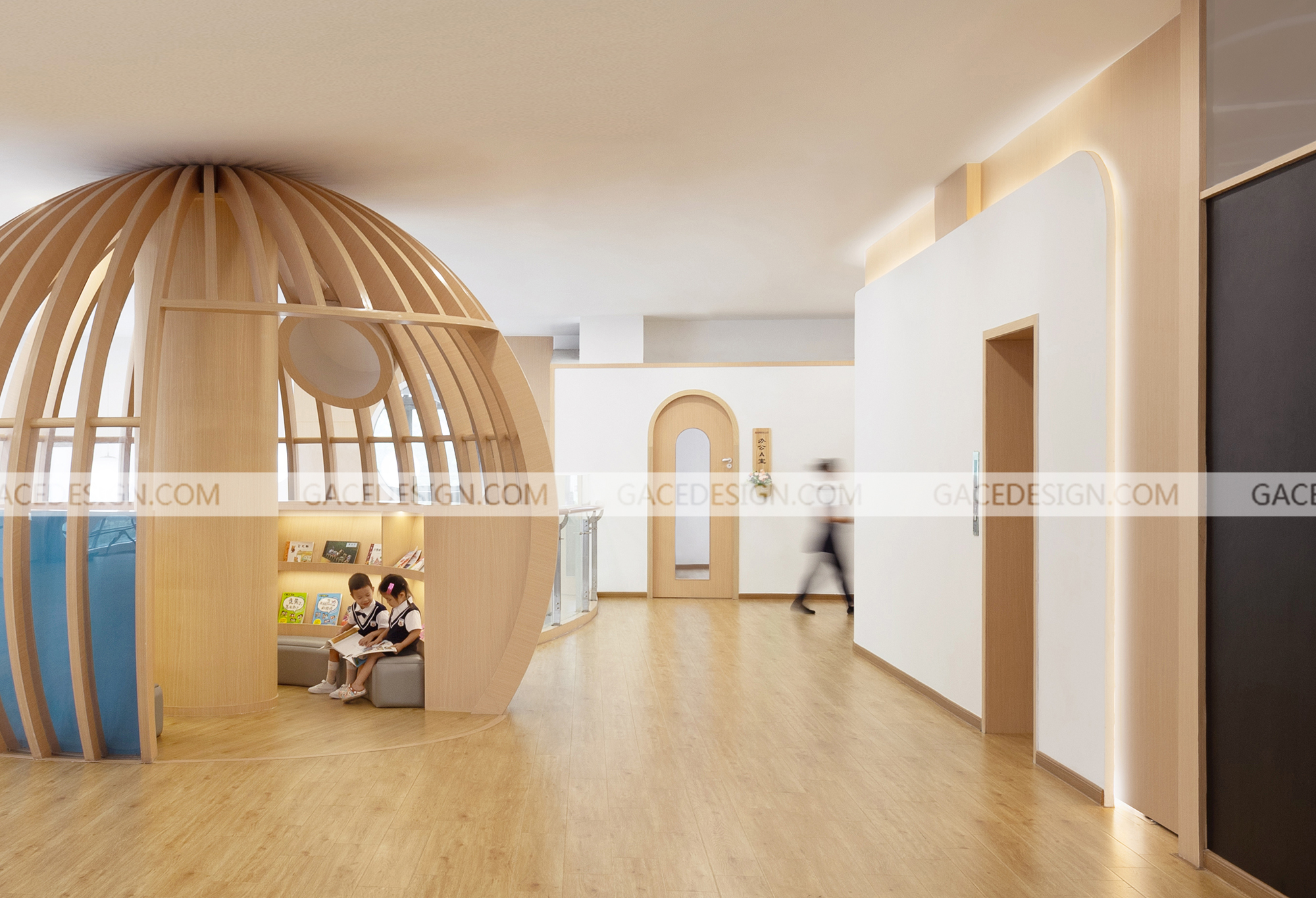 設計思考:隨著互聯網和人工智能的高速發展,知識的傳授方式基本上可以通過線上課程來完成。并給予孩子和家庭以更大的時間自由度來進行選擇。那么,作為物理性的教育空間如果不往前跑,是很難順應未來的教育變化。我們在思考未來的教育空間應該嘗試做些怎樣的改變?這次我們大膽的向未來踏出一步。通過對未來的思考加強對空間的整理并呼應「未來學園」的主題進行了空間環境的重塑。
