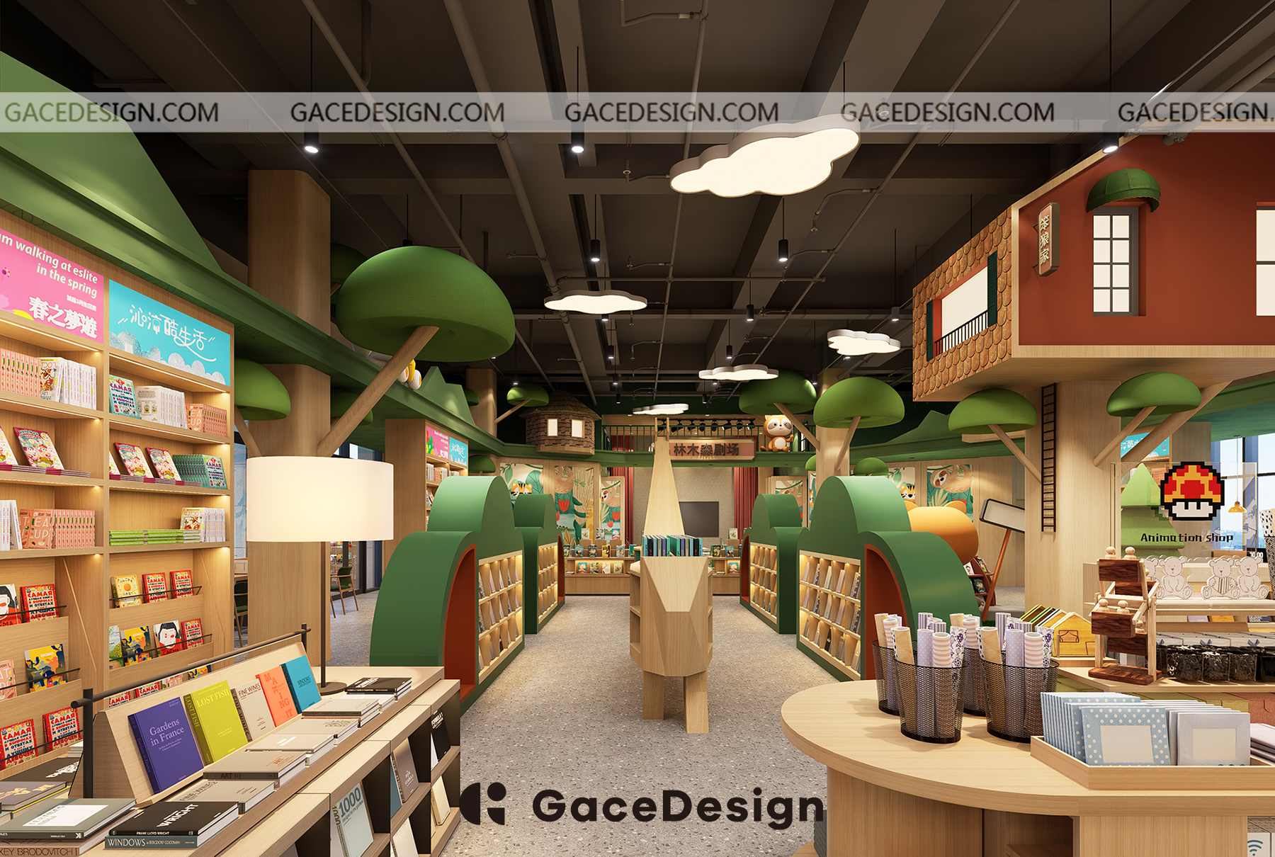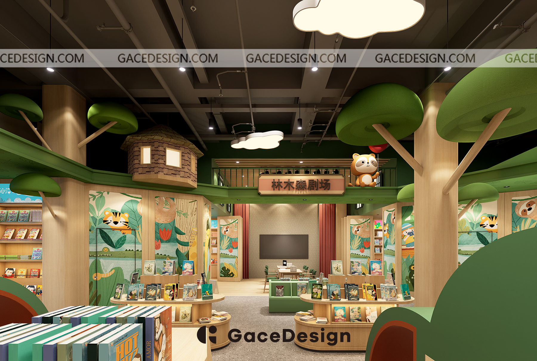 ? “笨狼家·林木森書店”坐落于湘江新區美麗的梅溪湖畔,是以笨狼媽媽湯素蘭童話作品為元素打造的兒童成長、休閑閱讀空間。 旁邊還有一條清澈的梅溪湖,周邊的自然風景很優美。設計師在設計上運用大面積落地玻璃,將內外景觀融合,讓自然與室內結合。