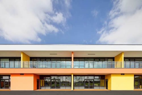 立面的背景是白色抹灰墻面,突出的單個構件涂有不同顏色的覆層。這些突出的構件用來指示設計的重要區域,如入口區、樓梯塔和主廳。教室之間的衛生間也用明亮的顏色突顯出來,用來強調小學生的入口處,并區分不同的教室。
