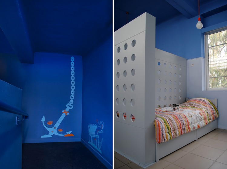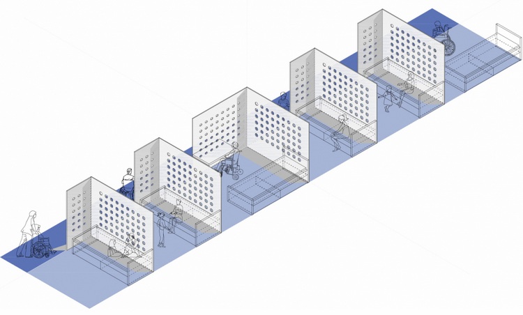 睡眠空間包含兩部分,一是隱藏空間,一是“凹處”。“隱匿處”的穿孔木制面板創(chuàng)造了獨立而且光學(xué)連續(xù)性良好的房間,而在“凹處”靠床一面的墻壁則被加厚,床深深嵌入環(huán)繞它的墻壁里,保證了在公共房間內(nèi)的隱私。