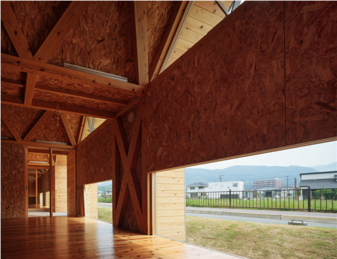 屋頂結(jié)構(gòu)采用折疊板設(shè)計,無柱空間是通過運用木桁架梁屋頂結(jié)構(gòu)實現(xiàn)的,形狀像一塊折疊板。所有支撐屋頂結(jié)構(gòu)的承重墻都被布置在建筑外圍。現(xiàn)在這座建筑分成了兩個保育室、衛(wèi)生間等,但將來也可以轉(zhuǎn)換為一個大房間。