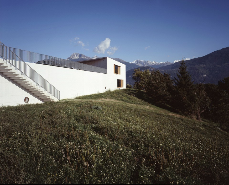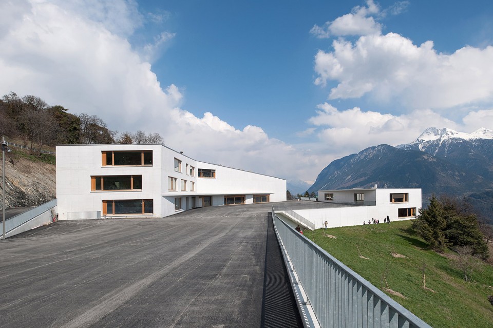 順應(yīng)著山勢,學(xué)校和多功能廳互成角度地連接在一起。兩者位于同一屋檐下,極大地方便了小朋友們使用體育館。反之 當大廳內(nèi)舉辦活動時,參與者也可以很便捷地使用學(xué)校的餐廳。兩層高的幼兒園位于南側(cè)稍低的地平上, 可以俯瞰整個山谷的美景非常壯觀。封閉的游樂場位于兩個樓層的中間平面上,方便到達和使用。