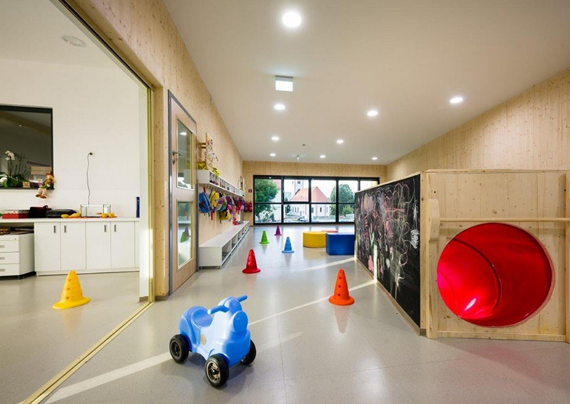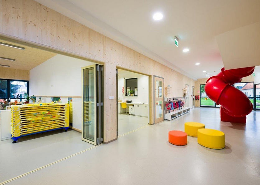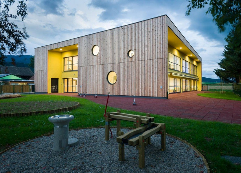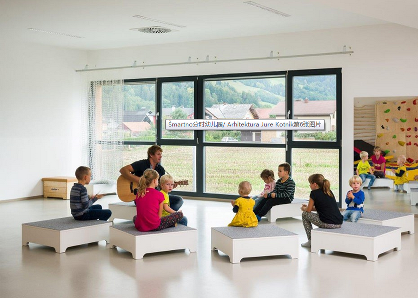 斯洛文尼亞的?martno分時幼兒園是低能耗房屋。幼兒園室內設計的是采用木材裝飾,所有墻面的木材都是當地取材,這也確保了可持續建筑的最高標準。建筑十分緊湊,所有的建設工作包含操場,都僅在四個月內完成,北向幾乎沒有開口,南立面則全部對外開放。