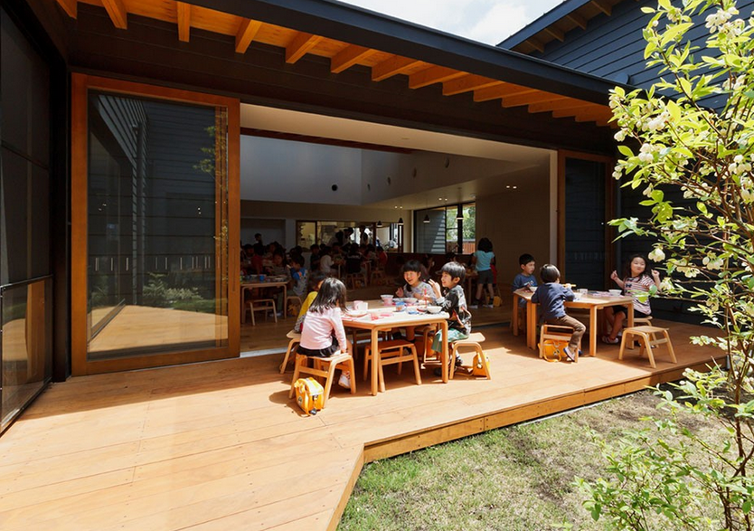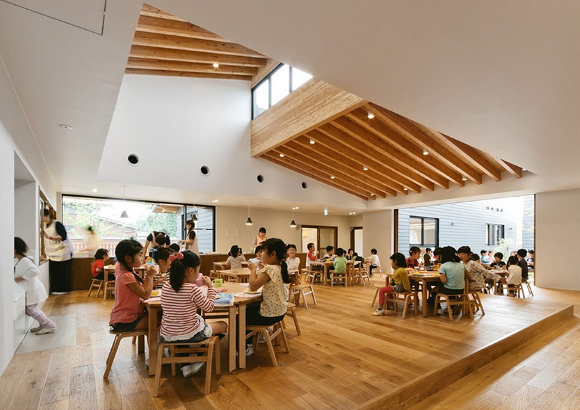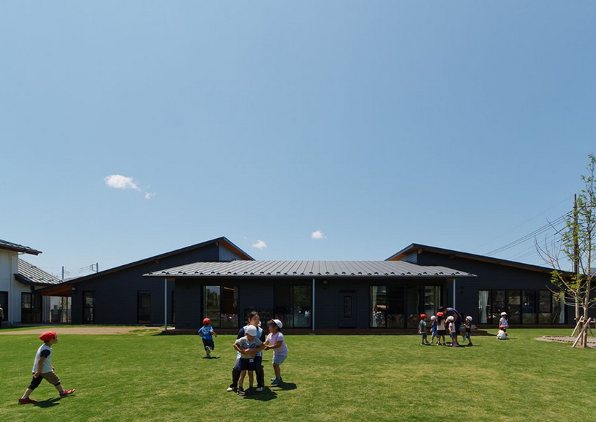 連接建筑物所產(chǎn)生的空間被用作庭院和按不同年齡段分類的花園。計劃中庭院的大小存在適當?shù)木嚯x,使孩子們可以看到同一水平的風景。在兒童衛(wèi)生間,面對庭院的圖畫書室、餐廳和嬰兒室,可以建立他們在生活中自然地看到彼此的關(guān)系。