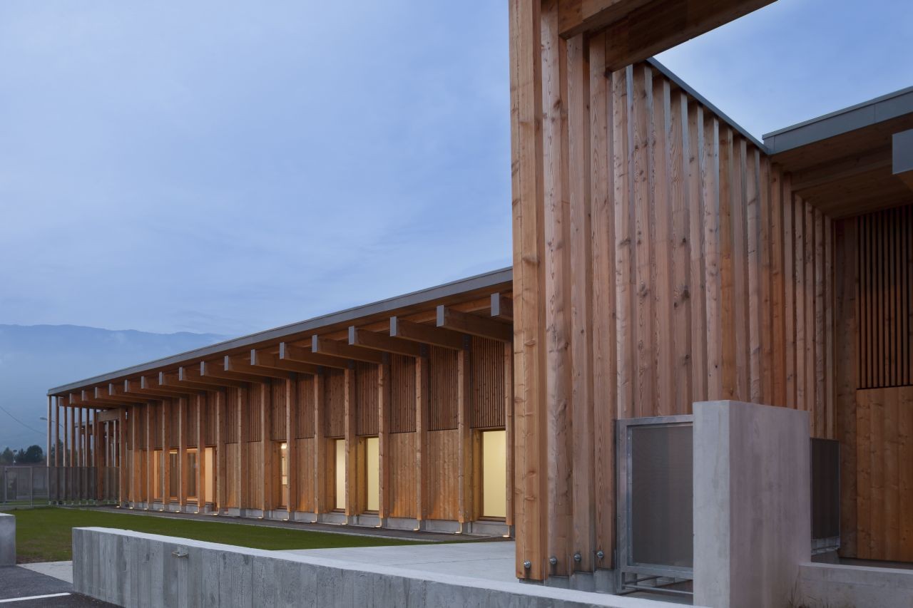 木材因生態(tài)與經(jīng)濟(jì)而被選中。作為自然而可再生的材料,它對(duì)健康沒(méi)有任何風(fēng)險(xiǎn),同時(shí)最大限度減少了碳排放。用于建筑的落葉松木可以采用高水平的預(yù)制,同時(shí)無(wú)論是建筑立面或其內(nèi)部結(jié)構(gòu)都不需要其他處理。北邊的木結(jié)構(gòu)和天井與混凝土相結(jié)合,從而保證最優(yōu)的保溫性能,同時(shí)尊重了防震需求。木結(jié)構(gòu)間充滿了粉刷與亞麻,從而獲得了高性能保溫墻體。建筑的密封性從早期研究到建筑工地都一直得到了重點(diǎn)關(guān)注。
