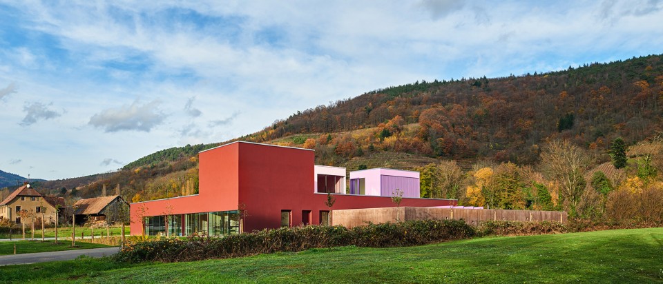 位于法國(guó)阿爾薩斯省一個(gè)小村莊的山谷入口處,建造著一所就像是用積木搭建兒童的樂(lè)園,環(huán)繞著幼兒園的蘋果樹(shù)和邊上連綿起伏的山丘隨著四季的變化成了幼兒園一道特別的背景,沿著幼兒園的邊界還有一條圍墻,墻上有著大小不一的圓孔,可以透過(guò)這些圓孔去看到外面的世界,這個(gè)很有趣的設(shè)計(jì)可以提供一些有趣的感覺(jué),滿足了孩子們的好奇心,而這面有趣的圍墻則如同衛(wèi)士一樣默默守護(hù)者在自由玩耍的可愛(ài)孩子們。