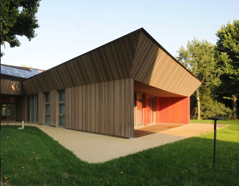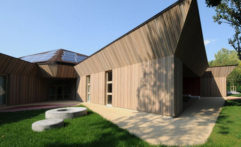 這棟建筑是由一系列連接著中心廣場的建筑群組成的,它的屋頂是不規(guī)則的幾何形狀,就像是皺紋紙一樣——這樣的形狀能更好地發(fā)揮光伏太陽能電池板的作用,這樣一來,在能源方面,這棟建筑幾乎是能夠自給自足了。建筑物的表層是由三種顏色的垂直條紋木板所組成,它們的尺寸是隨意組合的并一直延續(xù)到屋頂下的斜坡區(qū)域,形成了一種多變的紋理圖案,靜靜地被周圍的綠色所圍繞。檐廊及每片側(cè)翼的長廊仿佛是建筑群里的凹陷區(qū)域,并覆蓋了一層珊瑚紅顏色的垂直木板。這個(gè)設(shè)計(jì)好比是切片水果,里部的果肉是有色的,而外部的果皮是有紋理的。(幼兒園設(shè)計(jì))