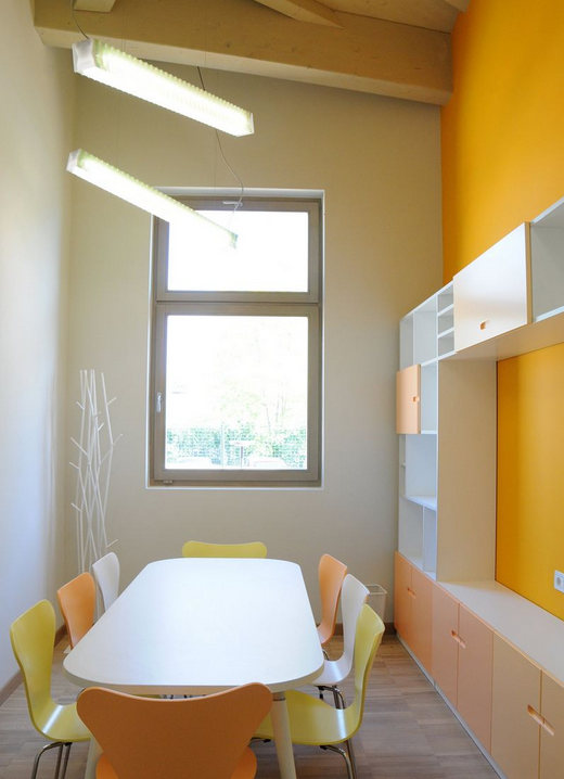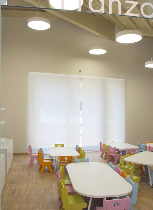 位于意大利的尼多卡利賓托兒所位于一個(gè)中型區(qū)域,通過一個(gè)中心廣場相互連通:這樣就能騰出很多空間給孩子們活動(dòng),而整個(gè)空間的比例是按照1-2歲的孩子們設(shè)計(jì)的。幾片側(cè)翼由一個(gè)單一的屋頂連接,而且都能通向中央大廳,走廊里還裝著空調(diào)。教室和“實(shí)驗(yàn)室”向南分布,優(yōu)先考慮自然采光和綠化帶;辦事處和服務(wù)區(qū)(洗衣房,更衣室,儲(chǔ)藏室)位于北面。