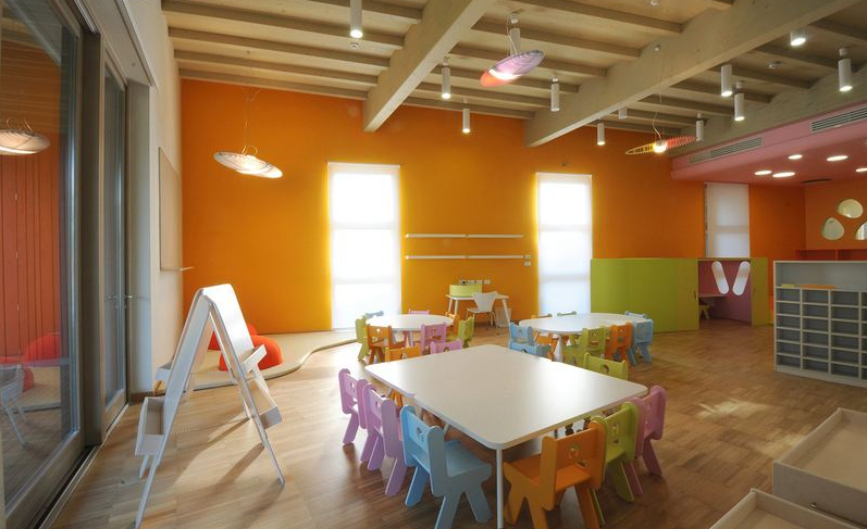 因?yàn)檫@些原因,孩子們應(yīng)該得到良好的環(huán)境并激發(fā)他們的感知。這并不意味著這是混亂的,混雜的,過多的,有著高標(biāo)準(zhǔn),它更是意味著復(fù)雜的,多變的,有著多語言的并能刺激不同的感官感受。幼兒園設(shè)計(jì)不止簡單的以紅黃藍(lán)去作為底色,而是匯聚了許許多多細(xì)微差別的色域,這些色調(diào)一一排列起來,形成了擺動(dòng)和多變的感覺。將互補(bǔ)的顏色排列起來,其對別的作用有效降低了顏色的飽和度和“容積”。這樣就能更好地創(chuàng)造出層次感:在整個(gè)環(huán)境空間使用低飽和度的顏色,家具選擇上使用溫和的顏色,景觀設(shè)計(jì)上使用更為明亮的顏色。(幼兒園室內(nèi)設(shè)計(jì))