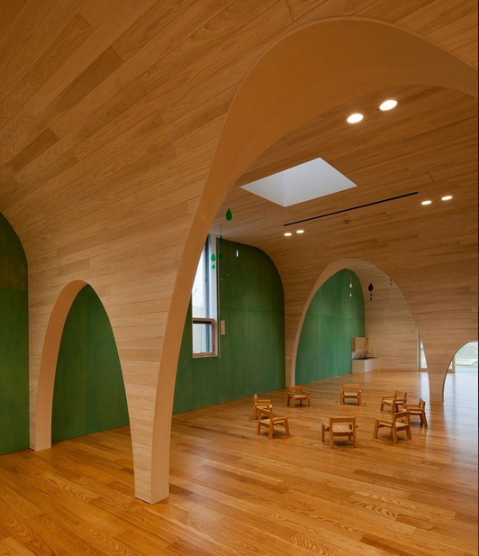 一所位于日本愛知縣張地區的旭城這是給五歲一下的一百多個孩子使用的幼兒園,在過去很多的幼兒園中孩子們的日常活動就像是吃飯玩耍和上廁所或者是睡覺都會是在分開的各個室內進行的,然后設計師的目標是想在一種連續時間狀態下去捕捉孩子的這些活動,并在這個時間容器中布局建筑以及藝術繪品,共同創造出好似一個立體圖畫書般的幼兒園。(幼兒園室內設計)