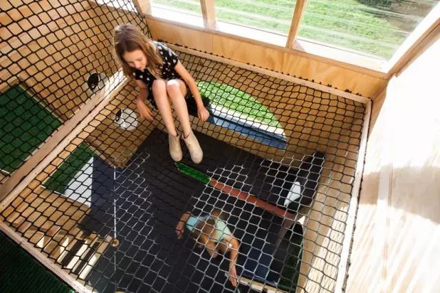 小木屋的頂部使用的是彎曲透明的屋頂,可以使得陽光能夠直接的照射到室內,還有就是屋內設置了一個很有趣味性的功能網,通過室內的小木梯可以上到屋頂下的掛網上玩耍是一個非常不錯的體驗。