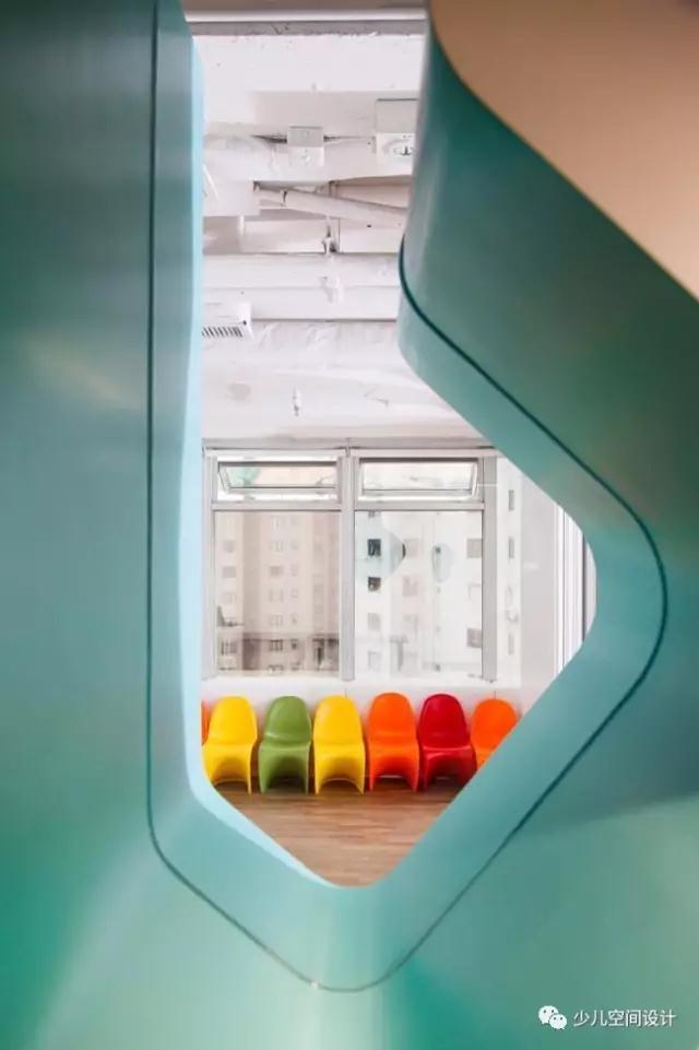 緊鄰的休息室是由鋸齒狀的三層平臺(tái)形成的區(qū)域,建在房間的一個(gè)角落,靠著窗臺(tái)玻璃幕墻的邊緣,并沒有占用孩子們的游戲區(qū)。無論是欣賞孩子學(xué)習(xí)的成果,還是日常點(diǎn)滴的進(jìn)步,休息區(qū)都為家長提供了一個(gè)完美的視角去觀察孩子。