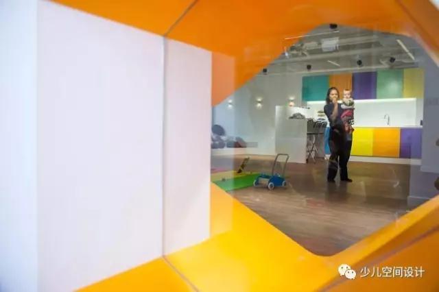 探索和運(yùn)動(dòng)區(qū)是幼兒樂園的重點(diǎn)區(qū)域。幼兒園室內(nèi)設(shè)計(jì) 在這個(gè)開放式的,明亮而怡人的活動(dòng)區(qū),可以容納多種運(yùn)動(dòng)方式:純粹運(yùn)動(dòng)的方式、感知觸覺的方式、還有安靜的方式。一面帶有幾何圖案的彩色墻壁極具特色,這堵墻圍成了一個(gè)儲(chǔ)存區(qū)角,并且自然而然地將活動(dòng)區(qū)內(nèi)不同方式的運(yùn)動(dòng)區(qū)分割開來。進(jìn)一步來說,這種分割還可以讓孩子和家長通過墻上幾何圖案的窗框看到教室里面的情景。
