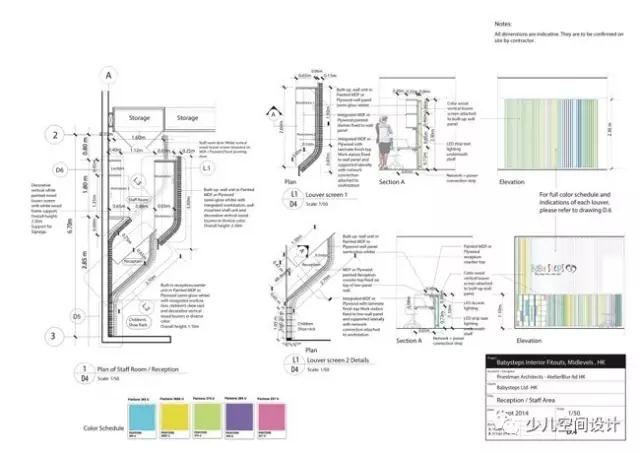 幼兒樂園的入口處設(shè)置了透明的玻璃門,純白色的金屬百葉窗,簡潔利落的百葉窗顯得美觀大方。入口的一側(cè)還設(shè)有接待臺(tái),同樣是由柔和彎曲的彩色百葉窗造型設(shè)計(jì)而成。Babysteps的標(biāo)識(shí)置于接待臺(tái)后面的墻上,五彩的字體設(shè)計(jì)更顯活潑可愛。燈光打在百葉窗上形成微妙的光影,使得BabySteps產(chǎn)生了一個(gè)工藝的視覺形象。