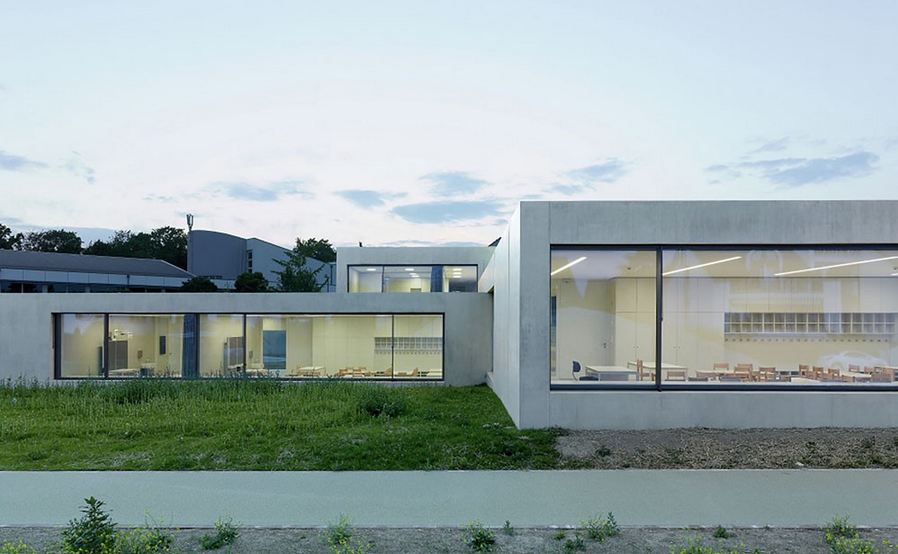 彼此垂直相交的建筑形體強調并遮蔽了入口區域。進入建筑內部,上層部分可以獨立使用,平面由大型房間(餐廳)構成,這些大房間可以根據不同需要靈活分隔。