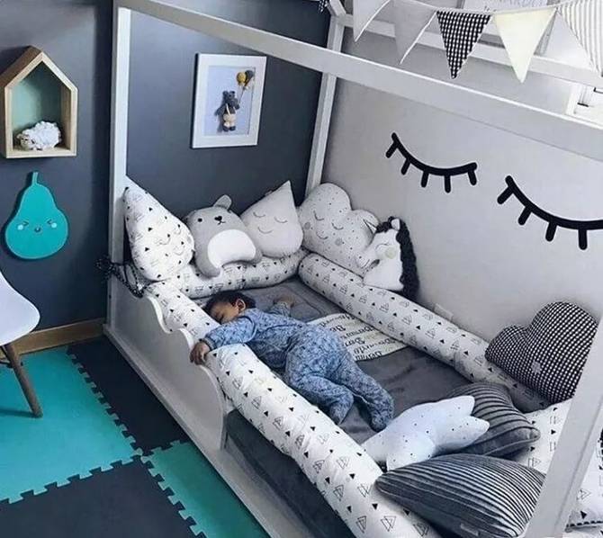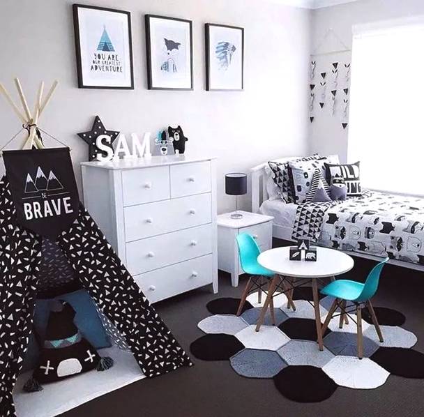 房間里還可以設(shè)置一些簡易的玩樂設(shè)施。1-3歲的孩子需要父母的時刻陪伴,我們可以在房間或者客廳放上爬行墊+安全圍欄給孩子一個小區(qū)域領(lǐng)地,把這里變成一個親子小游戲區(qū)。在兒童房里也可以在地面貼上玩具貼紙,把局部地面變成孩子的游戲地圖,適合在游戲中培養(yǎng)孩子創(chuàng)造力和分享的意識,留出空間,讓孩子可以和朋友或者和父母一起玩玩具,孩子1歲之后我們可以適當(dāng)添置一些矮柜來收納玩具,還可以讓孩子扶著學(xué)走路。在兒童床上加一個木架結(jié)構(gòu),把床做成木房子,給孩子一個開放的獨立空間。這種具象的區(qū)域不僅會給孩子安全感,還能滿足他們的探險欲,
