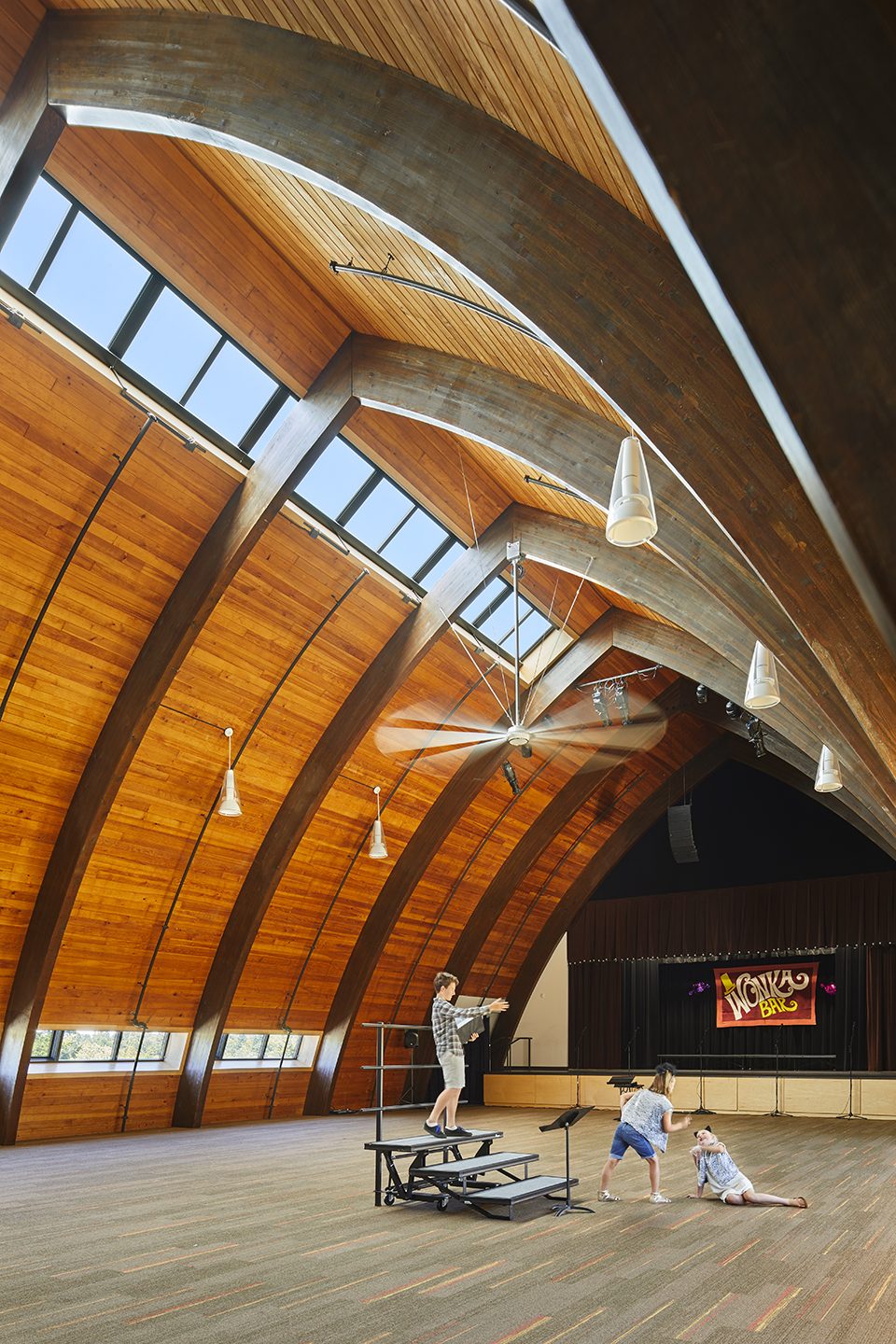 Westside中學致力于對既有的教堂進行大規模的修復和重新利用,同時盡可能地減少施工帶來的能源消耗。教堂中殿的叉骨形拱頂成為了本次設計的靈感來源。設計師保留了既有的45英尺長的膠合木拱頂,并對既有空間進行了重新配置,使其能夠容納教室、辦公室、服務空間、餐廳和儲藏室等,同時將既有的健身房保留下來。